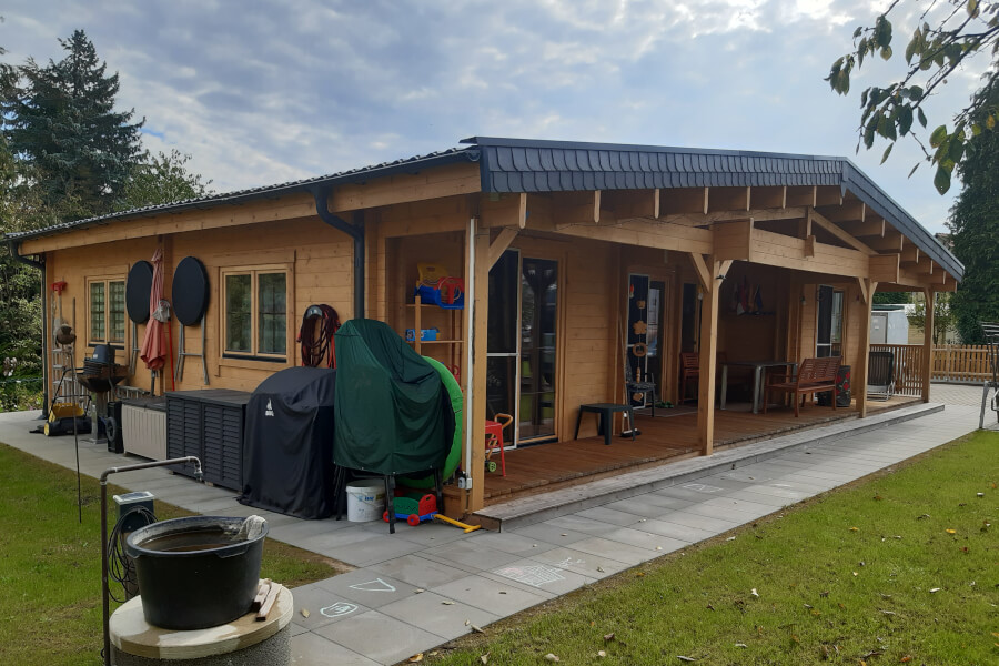 Nadat de kinderen volwassen waren geworden, begonnen onze klanten Lothar en zijn vrouw Doris erover na te denken om hun grote gezinswoning te verkopen en naar een compactere woning te verhuizen. De familie bekeek verschillende opties en vond uiteindelijk het klassieke houten huis RIVIERA, waar ze hun hele hebben en houden in konden onderbrengen. Ze kozen ook voor een bijpassende houten garage van 4x6 m, waarin ze hun auto's konden parkeren en een praktische werkruimte konden creëren. Het duurde enkele jaren voordat ze de juiste grond vonden om het huis op te bouwen, maar uiteindelijk was de lange zoektocht de moeite waard. Het leidde onze klanten namelijk naar een grote, prachtige tuin vol oude fruitbomen. Volgens onze klant Lothar waren de belangrijkste overwegingen voor het… (Meer) -