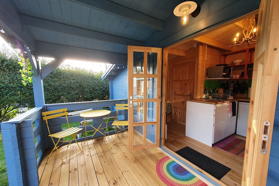 Toen we zagen hoe dit project was uitgepakt, waren we even sprakeloos! De stijlvolle buitenkant van de blokhut, geschilderd in een mooie blauwe tint, en het gezellige overdekte terras zagen er echt uitnodigend uit. We vroegen AJ om zijn ervaringen met ons te delen, uit te leggen hoe Blu Haven Studio Lodge tot stand is gekomen en ons te laten weten of alles soepel en volgens plan was verlopen. Hij antwoordde:
