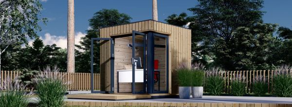 Een persoonlijke werkplek direct naast uw woning kan u helpen uw taken comfortabel af te ronden. Loop door de dubbele deuren naar binnen en bewonder de strakke lijnen en de gepolijste houten afwerking. Deze compacte tuinkantoor pod constructie neemt slechts 4 m² van uw tuin in beslag, maar het zal ongetwijfeld een nieuw niveau van verfijning creëren. Daarnaast zien de grote ramen en open ruimte er inspirerend en uitnodigend uit - u zal zeker uw tijd hier willen besteden!